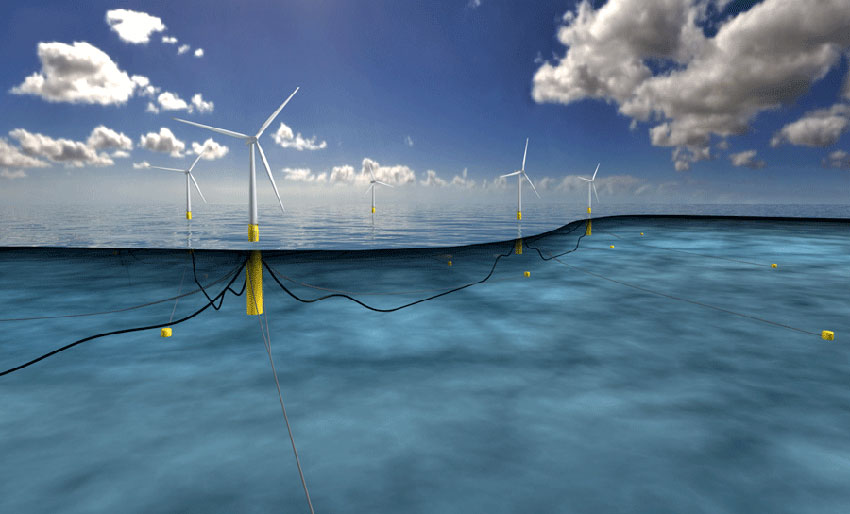 Norge satser 2,3 milliarder på Equinor-prosjektet Hywind (illustrasjonen viser Hywind Scotland Pilot Park). Foto: Equinor/www.origo-solutions.com