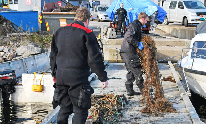 Medlemmer i Søgne Dykkerklubb i aksjon med å fjerne spøkelsesteiner.