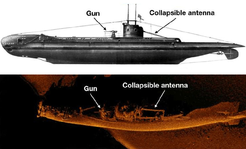 Et sonarbilde avslørte vraket av ubåten på 130 meters dyp, og funnet ble senere bekreftet ved hjelp av en fjernstyrt undervannsfarkost (ROV).