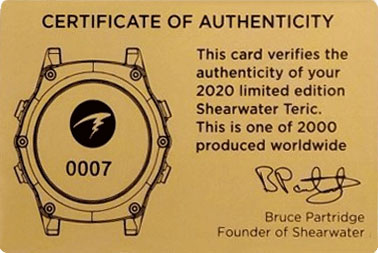 Med computeren følger et nummerert sertifikat signert av grunnleggeren av Shearwater, Bruce Partridge.