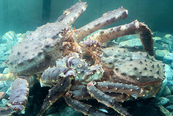 Det er masse kongekrabbe å se under vann, og et par av de piggete kjempene var også å finne i akvariet på Bistroen i Bugøynes.