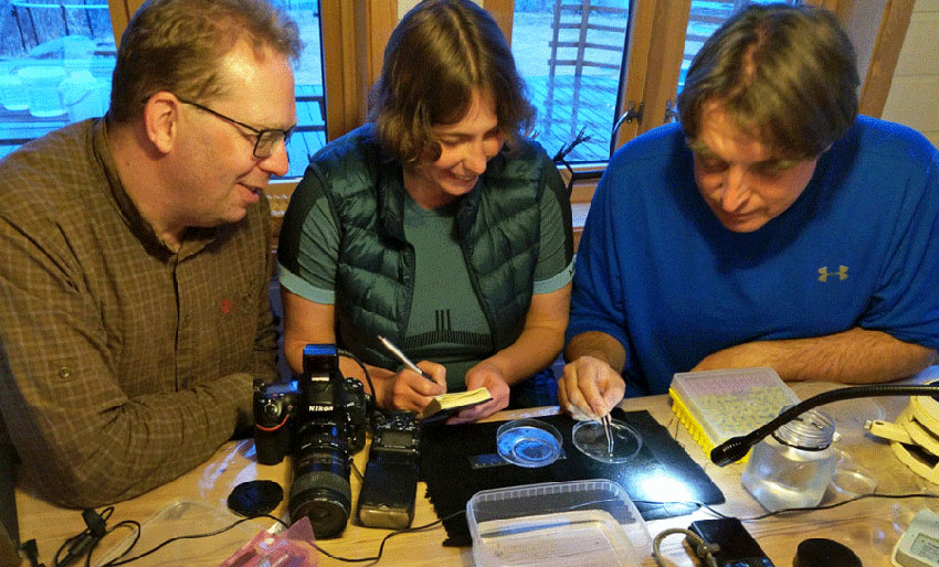 En gjeng svært fornøyde forskere etter å ha funnet Zelentia ninel for første gang i Norge. Fra venstre Karstein Hårsaker, Tatiana Korshunova og Alexander Martynov. Foto: Torkild Bakken.